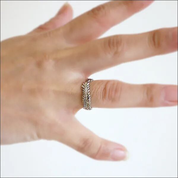 小さな羽が何枚にも重なり合わさったデザインのリングは燻したようなヴィンテージ加工を施し、程よいエスニックテイストが漂います。
