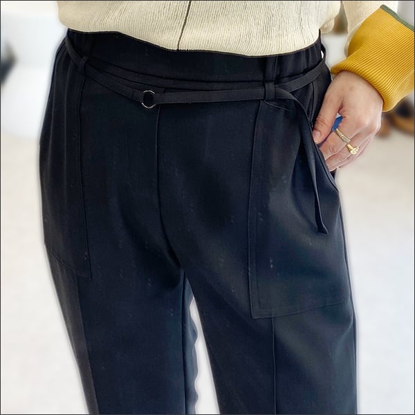 大きめのサイドポケットは気になるモモ周りをカバーしてくれる優秀デザインで、前後に入ったセンタープレスは脚に奥行きを出してくれるので立体的なシルエットで美脚効果も期待できます。