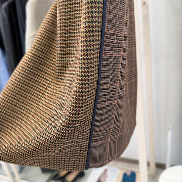 前後で異なるチェック生地を組み合わせた遊び心あるデザイン。