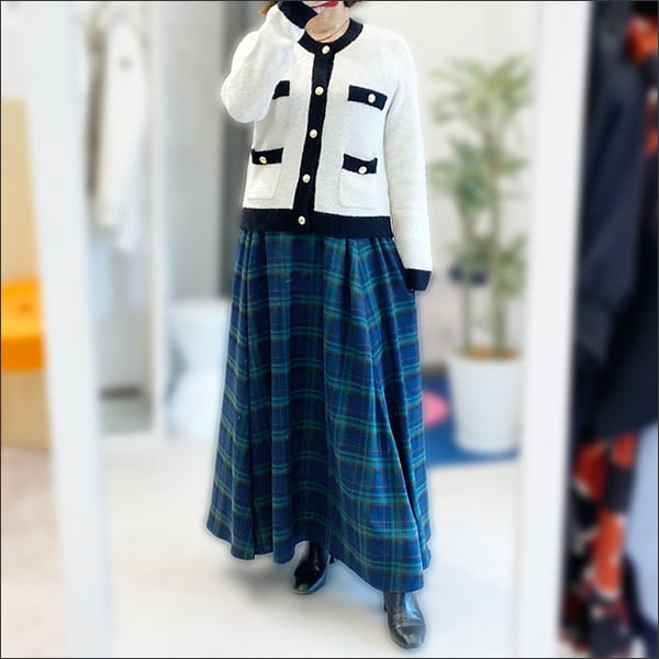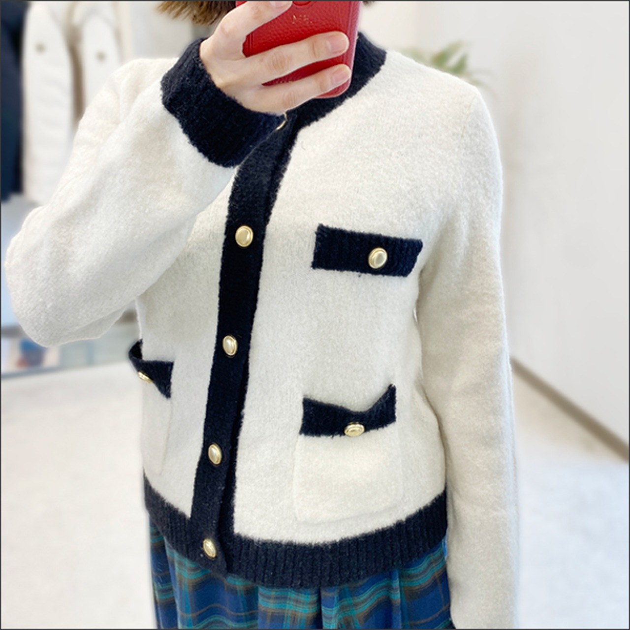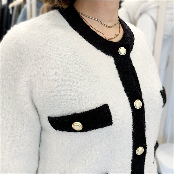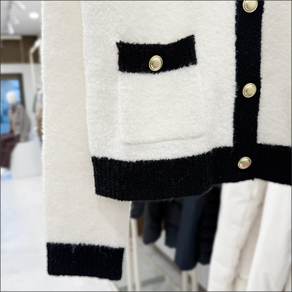 ゴールドボタンがアクセントになったバイカラーカーディガン。