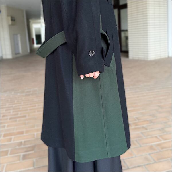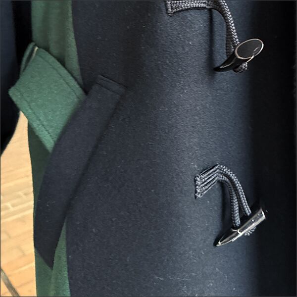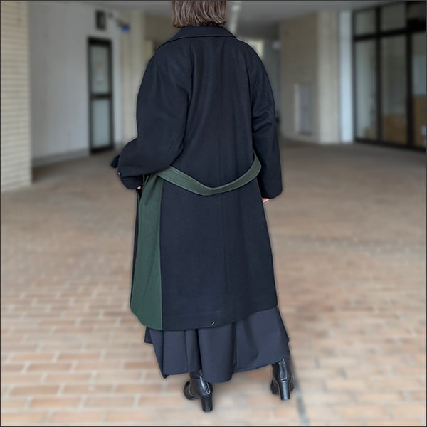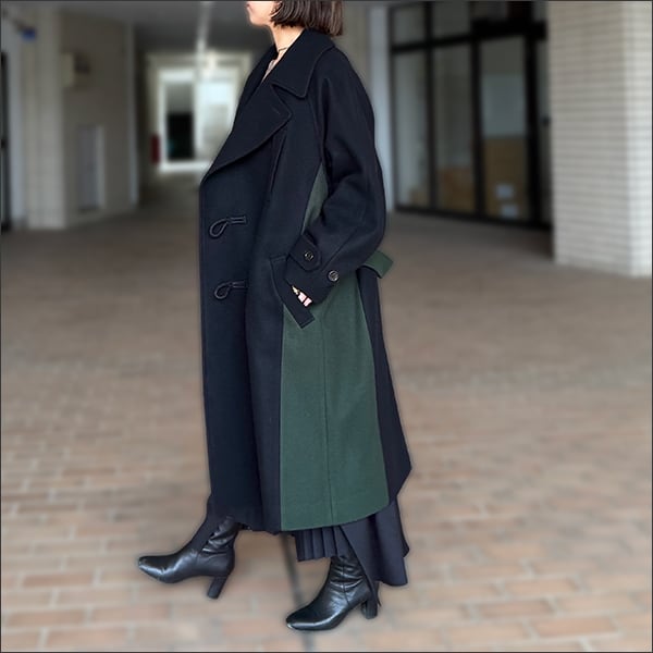 分断された衣服の要素、伝統的なトグル留めをダッフルコートと身頃のディティールはPコートから、既存の断片を組み合わせて新たな形を生み出す手法で再構築しています。