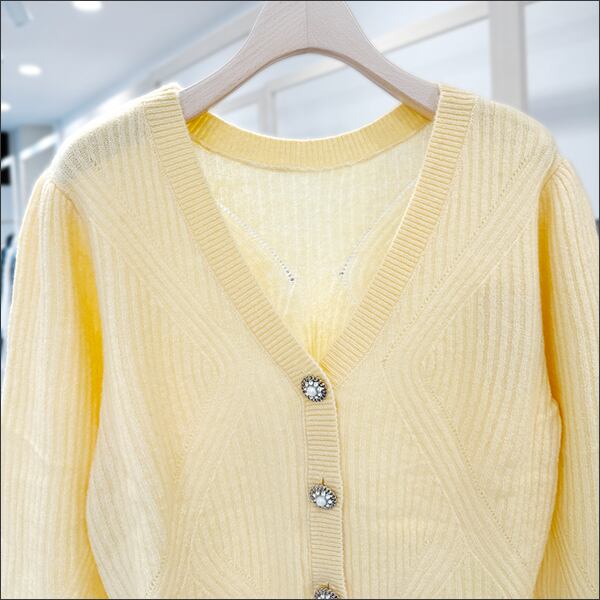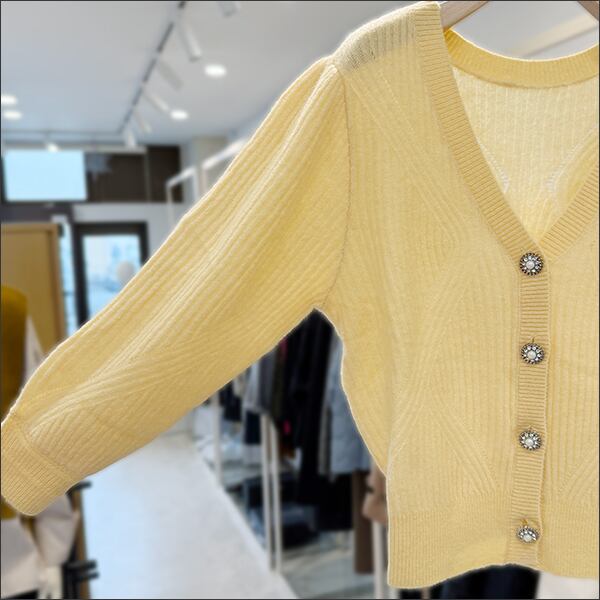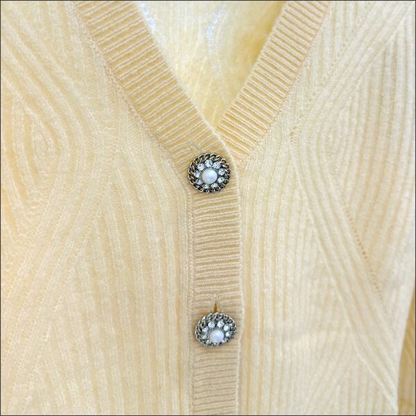 編みのデザインとカラーコントラスト、デザインボタンのバランスが絶妙な一枚。