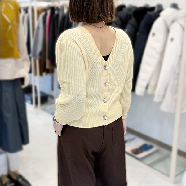 前後着用可のVネックニットカーディガン。