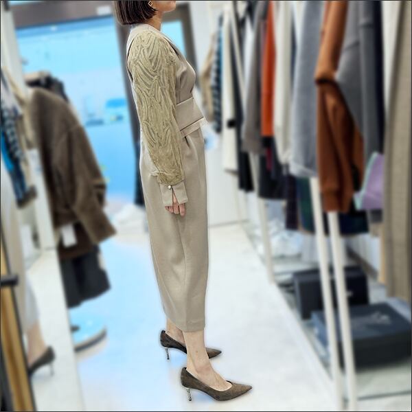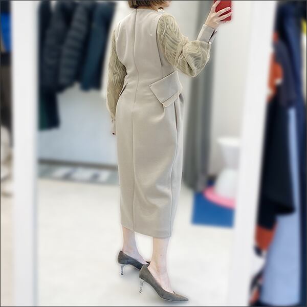 ヒップにゆとりのあるコクーンラインを採用し、ウエストにはインパクトのあるフラップをつけることでさりげない体型カバー効果も。