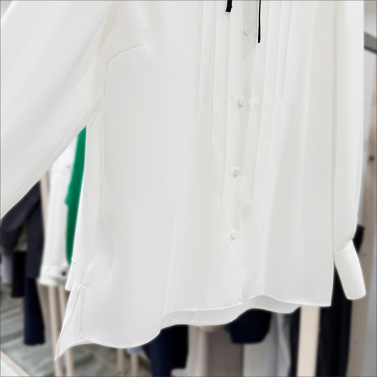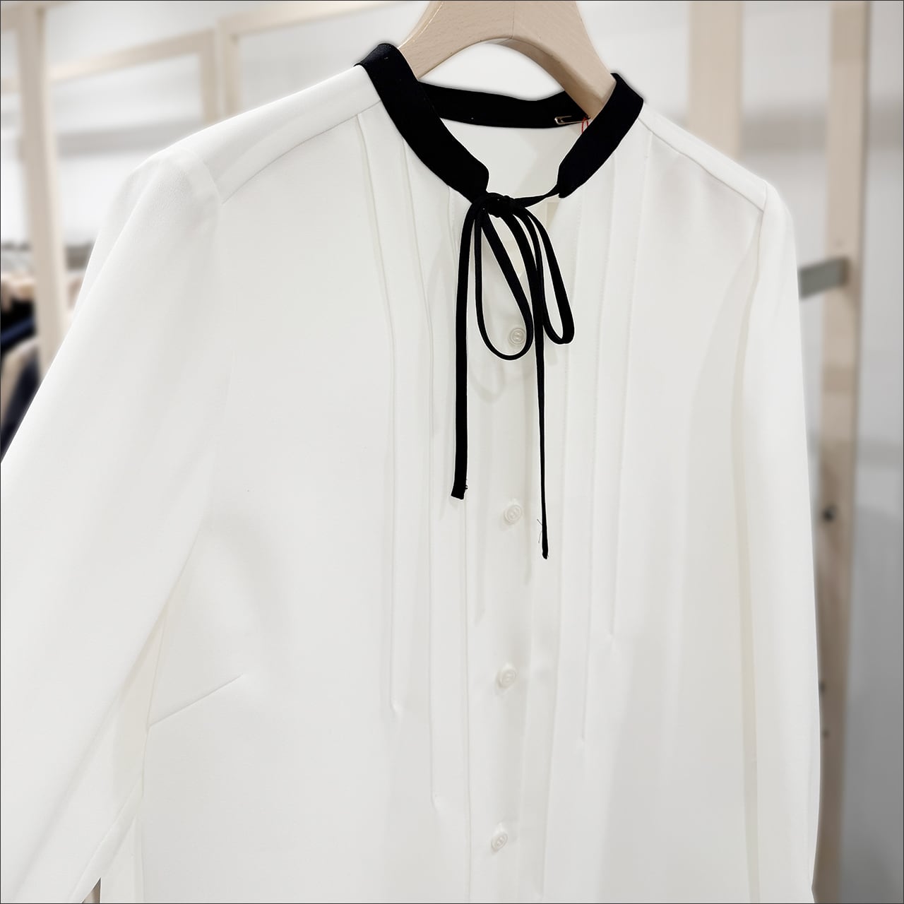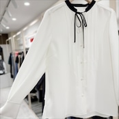 さり気ないリボンデザインのタックブラウス。