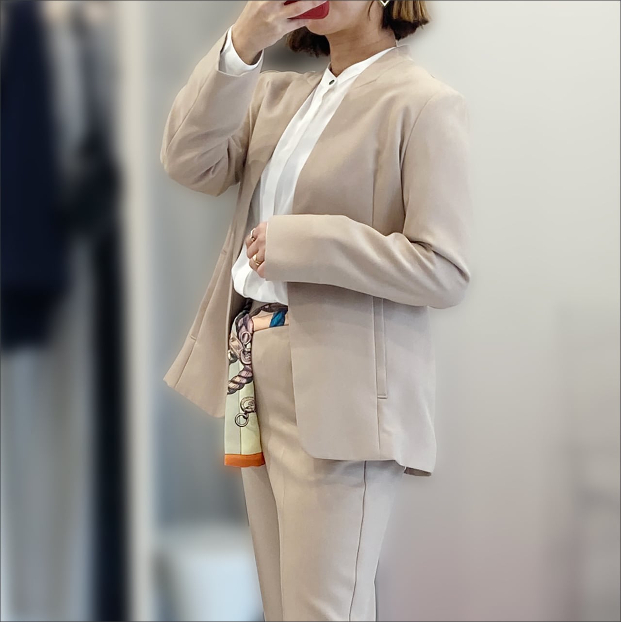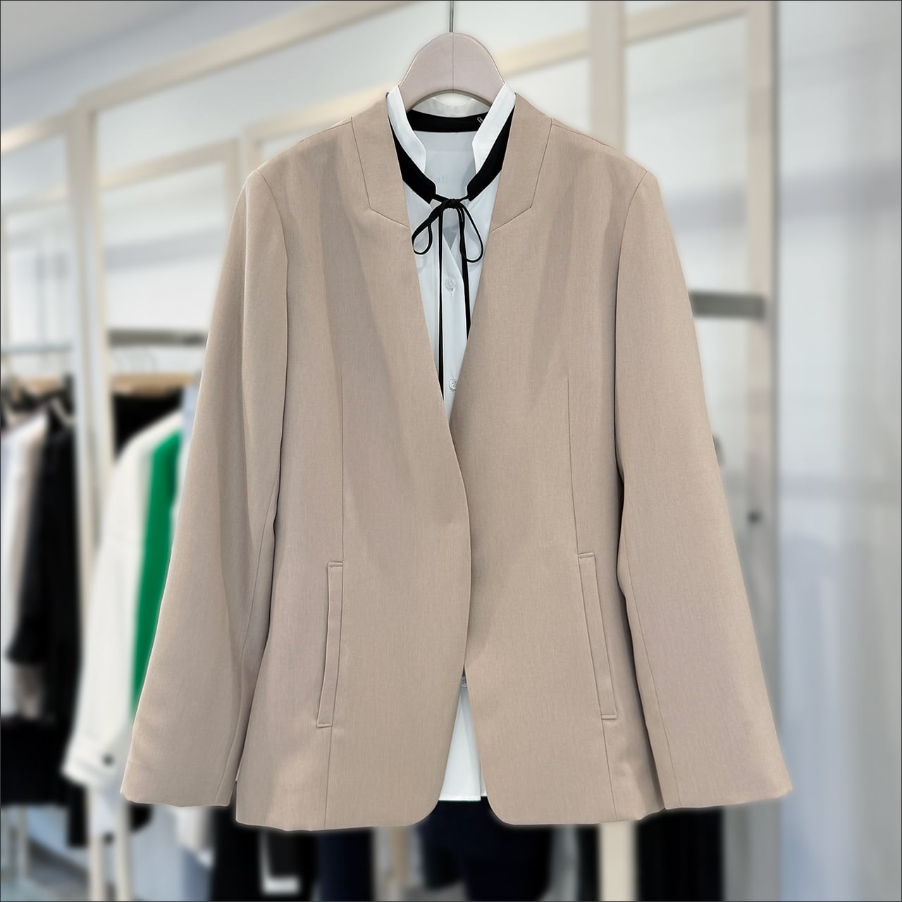 デコルテがすっきり見えるシャープなネックラインと、ウエストのなだらかなシェイプを損なわない縦ポケットにこだわりました。