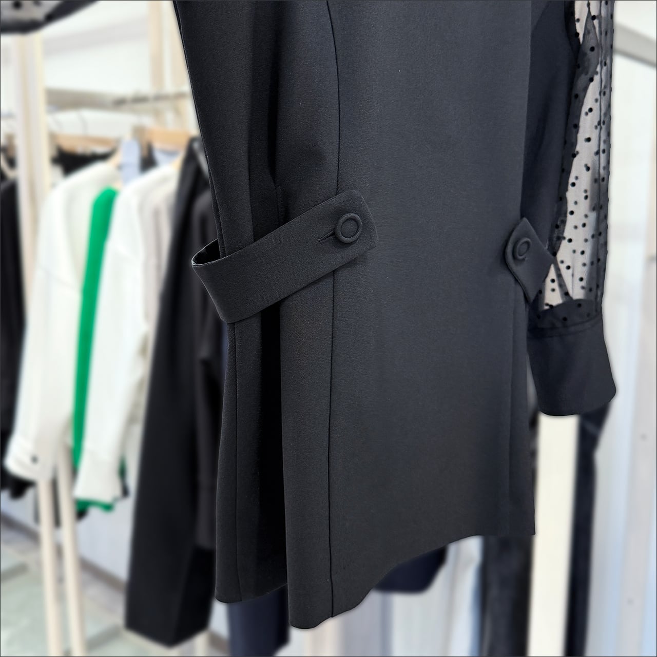 サイドのペプラム風デザインがストンと落ちた身頃と対比してフェミニンなムードを盛り上げます。