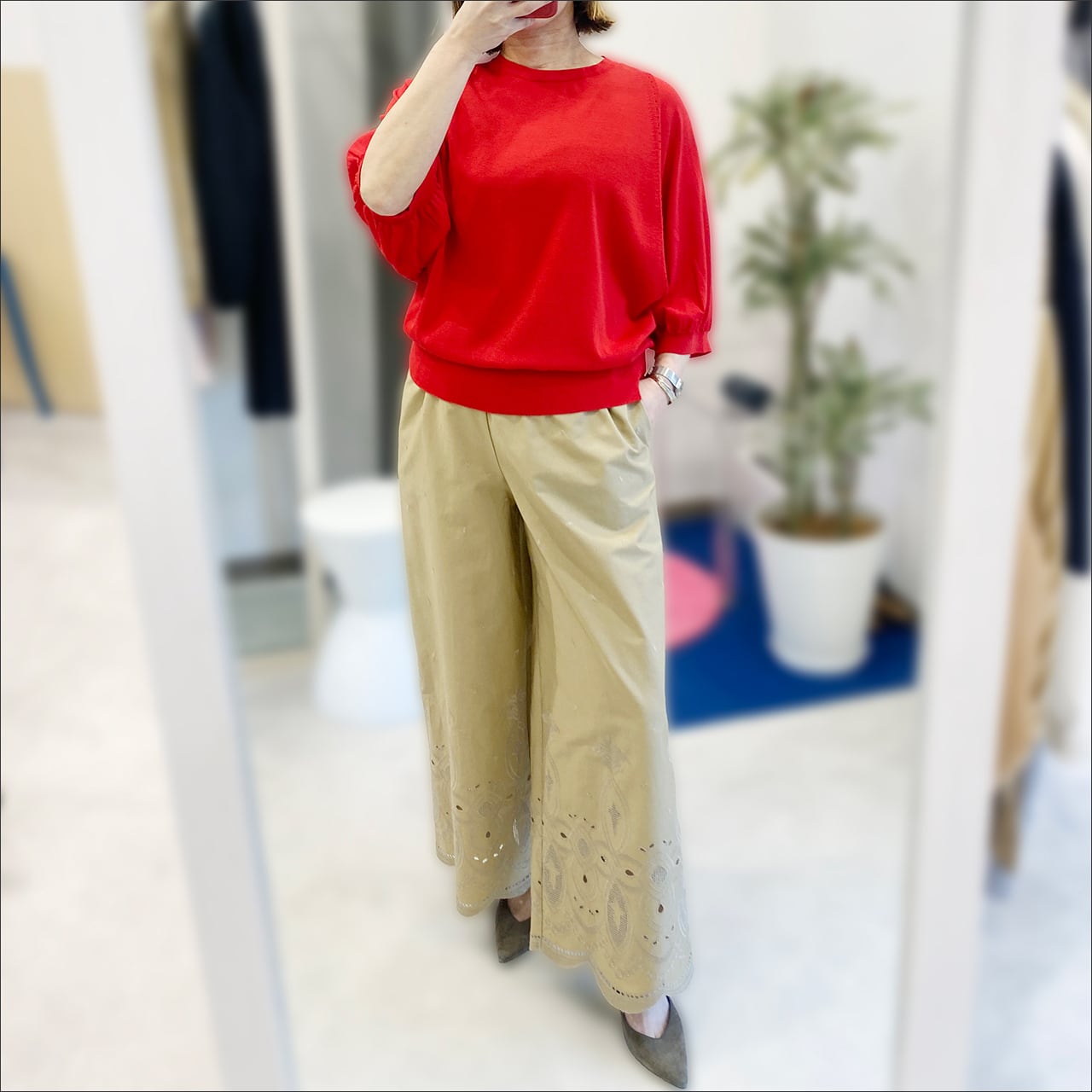 ドルマン風のボリューム袖で、どんなボトムにも合わせやすいニットプルオーバー。
