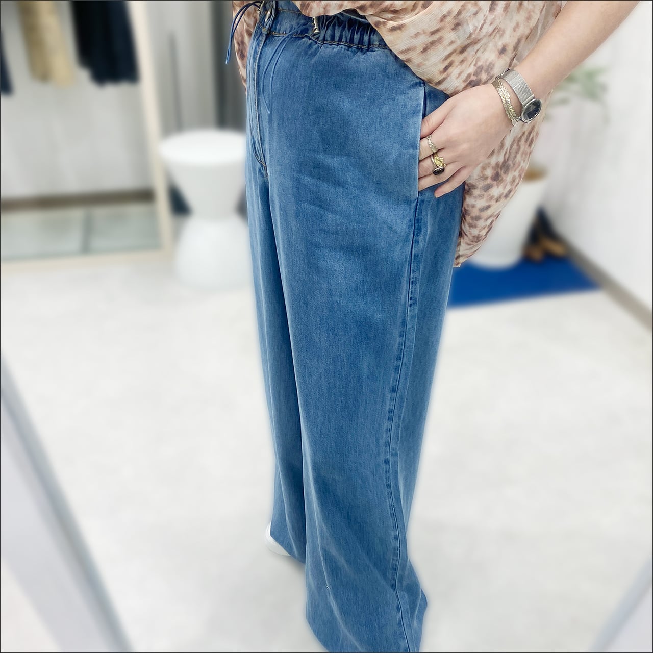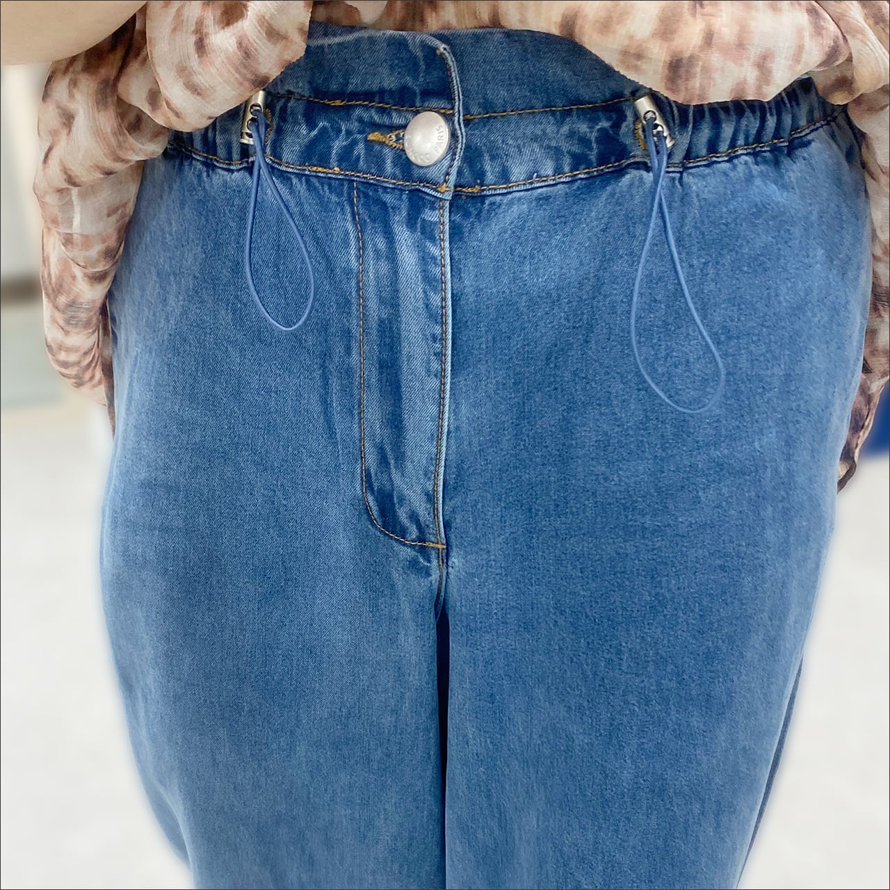 ハイウエストのワイドパンツ。