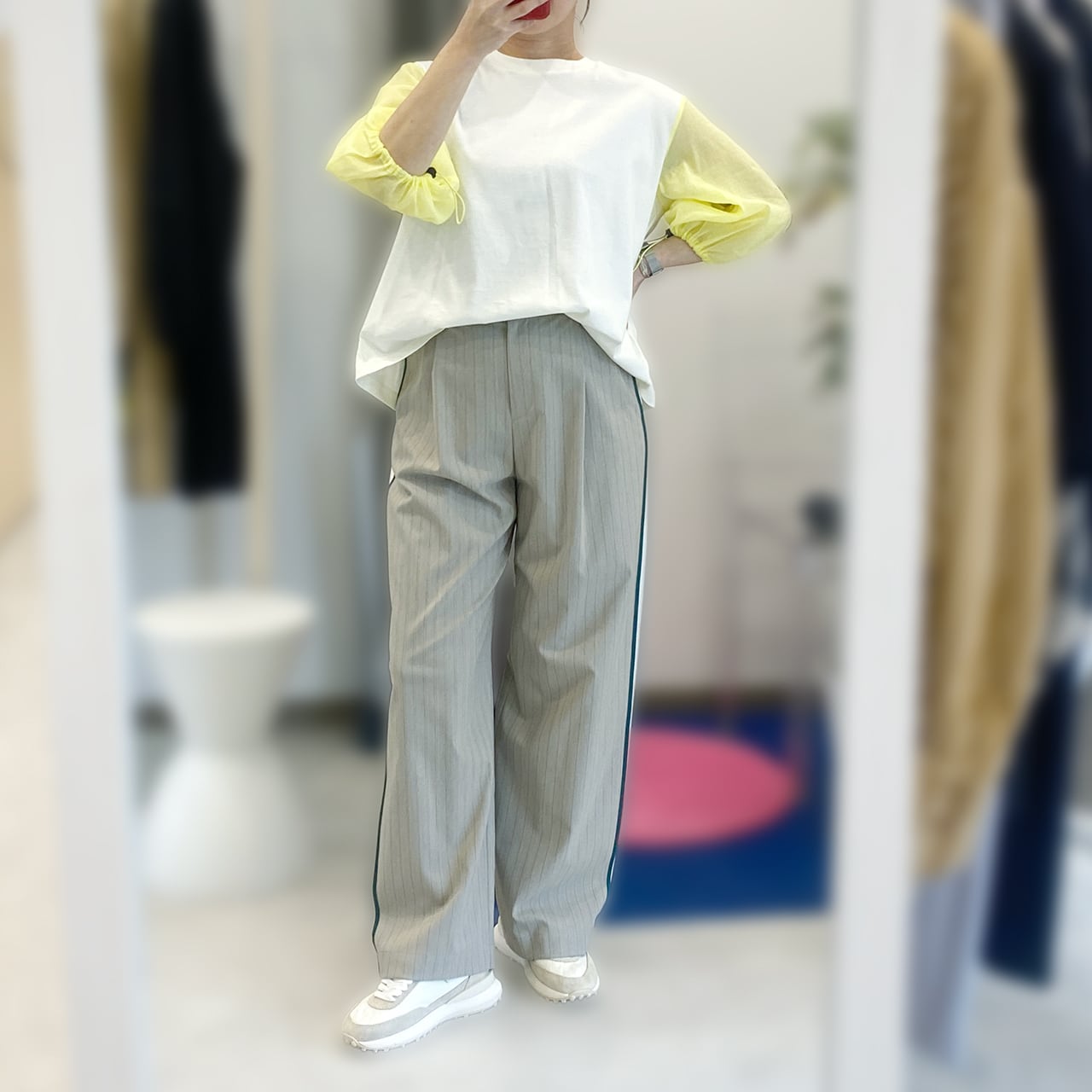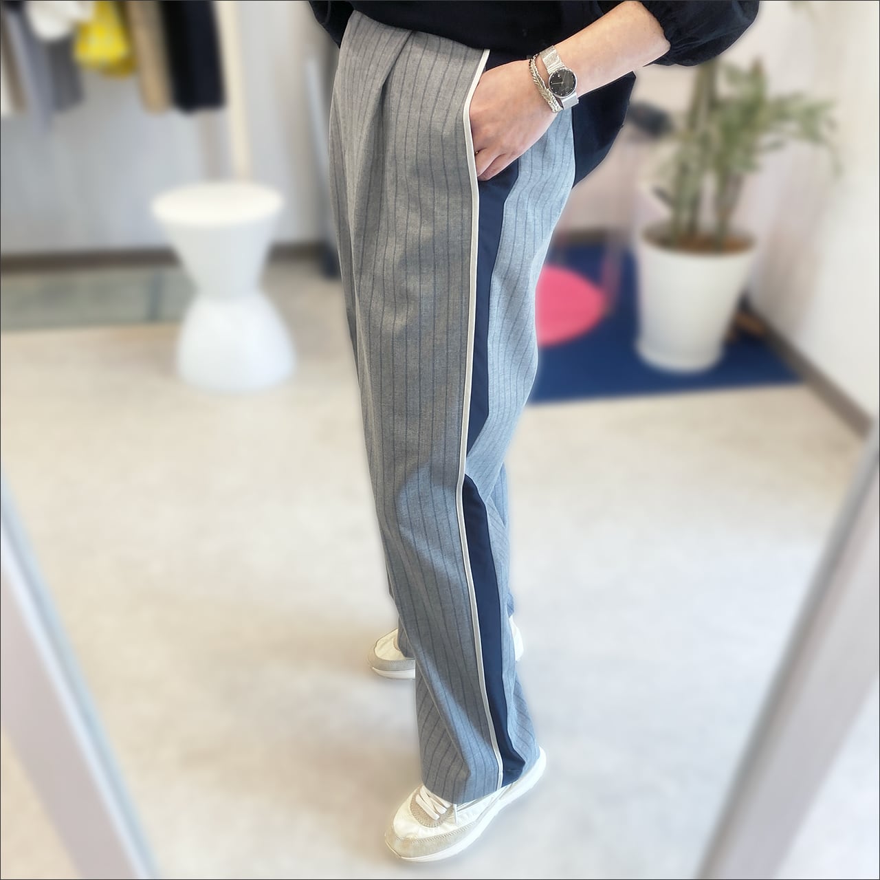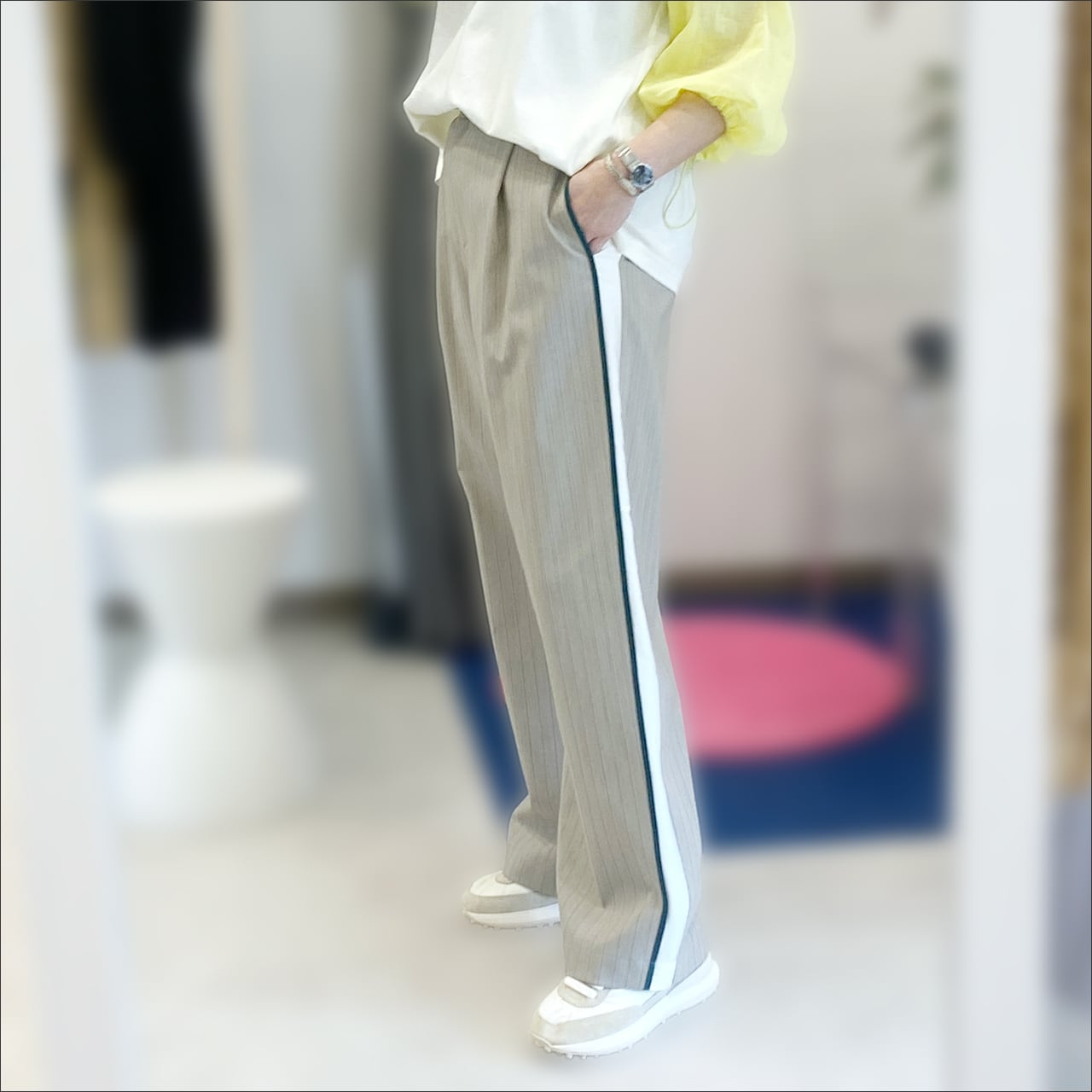 軽やかな素材感にワイドストレートのはき心地抜群のパンツ。
