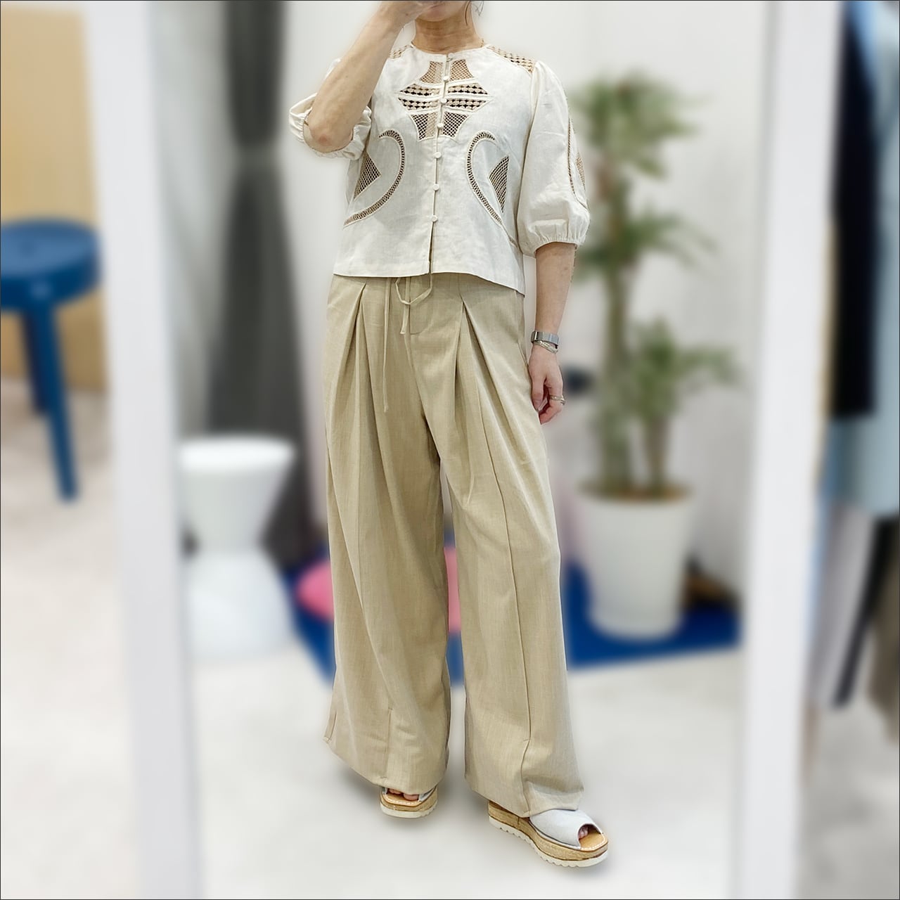 タックの入り方がポイントのかっこいいワイドパンツ。