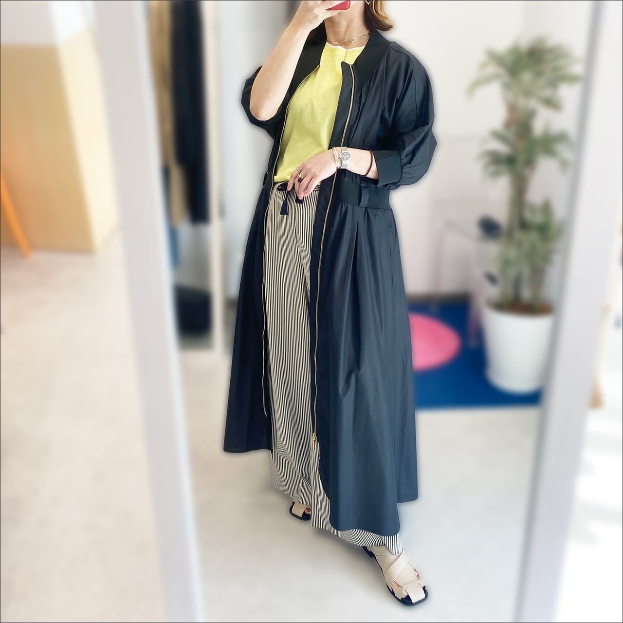 ジップは下までしっかりとあるので、一枚でしっかりとワンピースとして使えて、前を開けて羽織り仕様でも使えるデザイン。