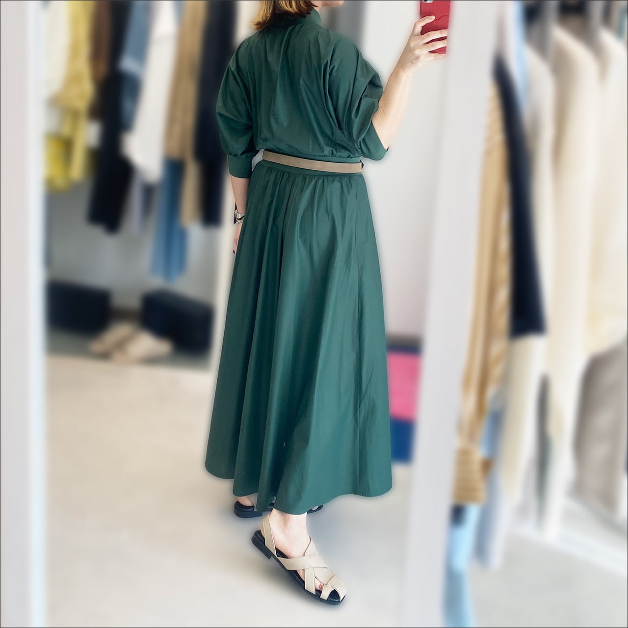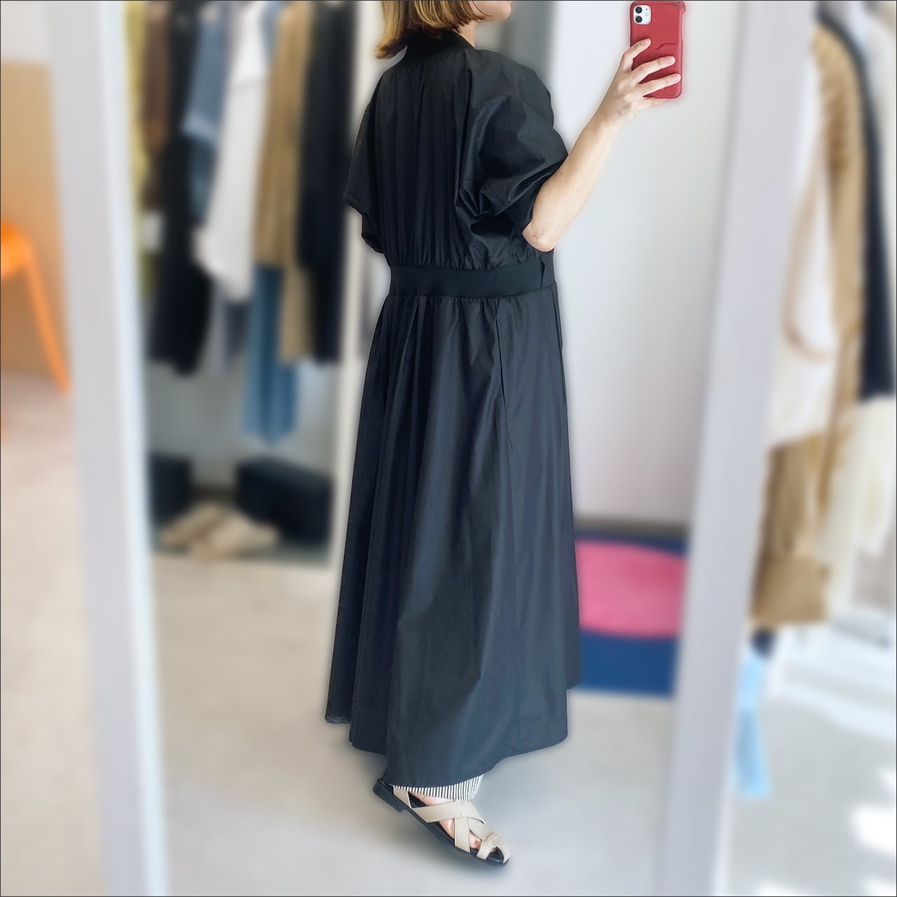 ウエスト部分に切り替えアクセントがあるのでスタイルアップ効果も抜群です。